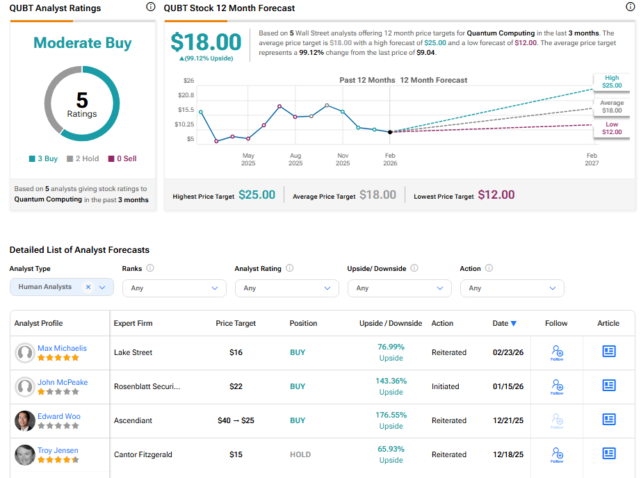 TipRanksによると、QUBT株は過去3ヶ月で3つの買い推奨と2つの保留を受けており、コンセンサス評価は「中程度の買い」です。平均的な量子コンピューティング株の目標価格は18.00ドルであり、現価格から約99.12%の上昇余地を示しています。