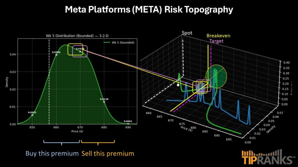 メタ・プラットフォームズ(**$META**)は、より広範なテックエコシステムの巨人である一方で、セクターの圧力から免れるわけではありません。その中で、人工知能に関するバブルの兆候への不安が高まる中、多くの投資家が様子見をしています。この慎重さの明らかな犠牲者の一つがMETAの株価であり、今年初めから約0.5%の価値を失っています。### 50%オフのClaim 50% Off TipRanks Premium* ヘッジファンドレベルのデータと強力な投資ツールを解放し、より賢く鋭い意思決定をサポート * 最新のニュースと分析で市場をリードし、ポートフォリオの潜在能力を最大化過去52週間 — いくつかの激しい変動にもかかわらず — 株主はわずかにマイナスとなっています。このような結果は、長期保有派にとって非常に苛立たしいものですが、この非エルゴジティ性はオプション取引者にとっては金鉱かもしれません。特定の取引を特定の期間に設定することで、利益を確保できるチャンスのウィンドウ内で利益を狙うことが可能です。この方法で、複数の勝利を積み重ねることができ、セキュリティが一貫して味方してくれることを期待するのではなく、勝ち取ることができるのです。ただし、未来を論理的に推測する株式市場のシステムは存在しません。言い換えれば、セキュリティは必ずしも「低い倍率」や「ヘッド・アンド・ショルダー」パターンによって動くわけではありません。ただし、過去の実証的なシグナルの観察から帰納法を用いて、その行動を推測することは可能です。つまり、過去の事例を観察することで、次に起こる結果を確率的に予測できるのです。帰納法は完璧ですか?いいえ、その理由のほとんどは未来を絶対的に知ることができないからです。しかし、これは株式を取引する最良の方法の一つとも言えます。最小限の仮定を用い、魔法のような思考ではなく経験主義を基に意思決定を導くからです。この分析手法を用いることで、Meta株に対して強気の見方を持つ理由が生まれます。**ボラティリティスキューを利用してMETA株の情報収集**-------------------------------------------------------楽しい話に入る前に、まずMETA株について利用可能な一次(観測)データをすべて集めましょう。一次とは、ウォール街が使う標準的な指標、論争の少ない指標のことです。その中でも特に重要なのがボラティリティスキューです。定義によると、スキューはインプライド・ボラティリティ(IV)を示す視覚的指標であり、特定のオプションチェーンのストライク価格範囲にわたる株の潜在的な動きの範囲を表します。基本的に、これはボラティリティ空間の表面積の歪みを明らかにし、リテールトレーダーがスマートマネーのリスク管理方法を理解するのに役立つツールです。META株の3月20日満期のスキューを見ると、コールとプットのIVは左側の境界(低ストライク側)に向かって上昇しています。この設定は、スマートマネーのトレーダーが特にテールリスクの低減にプレミアムを支払う意欲があることを示しています。一方、より高いストライク側ではスキューは比較的浅く、上昇の凸性に対するエクスポージャーはそれほど重要視されていないことを示唆しています。サッカーやフットボールの用語に例えると、META株は基本的に5-4-1のフォーメーションのような構造です。監督は、前線のフォワード2人の代わりに追加のディフェンダーを配置して試合を進めることを選択しています。スマートマネーは守備的に考えていますが、逆張り派はコールオプションをボラティリティの観点から比較的安価とみなすかもしれません。これが私たちが狙うギャップです。**Meta Platforms株の取引パラメータの設定**------------------------------------------------META株がどのようなフォーメーションで動いているかを特定したとしても、それが実際の価格結果にどう反映されるかを知る必要があります。そのために、ブラック-ショールズモデルを利用します。ウォール街の標準的なオプション価格付けモデルによると、3月20日満期のMETA株はおおよそ$614.25から$691.03の範囲に収まると予測されます。数学的には、ブラック-ショールズは株式市場のリターンが対数正規分布に従うと仮定しています。したがって、この分散範囲は、メタ・プラットフォームズの株価が標準偏差の範囲内で対称的に動く可能性を示しています(ボラティリティと満期までの日数を考慮して)。ただし、このモデルはあくまで参考値であり、予測ではありません。ブラック-ショールズの式は静的(ボラティリティと時間だけが変数)であるため、ゴールキーパーやディフェンダーのパスのように、自由に利用できるパスのようなものです。しかし、サッカーは静的なゲームではなく動的なゲームです。最も危険なパスは、相手に向かって直接出すのではなく、空間に向かって出すものです。実際、サッカーの醍醐味は、攻撃的ミッドフィールダーが味方が走り出す瞬間を予測して動くことにあります。言い換えれば