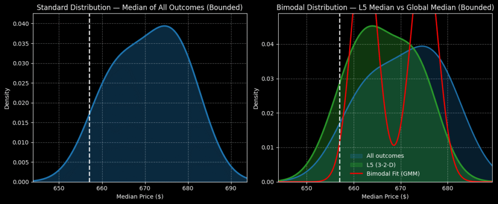 列挙帰納法とベイズ推論を用いて、META株は$640から$690の間で取引される可能性が高く、確率密度は約$663でピークに達すると計算されます。ボラティリティスキューが下落リスクに偏っているため、比較的低価格で魅力的なコールオプションを多く手に入れることが可能です。