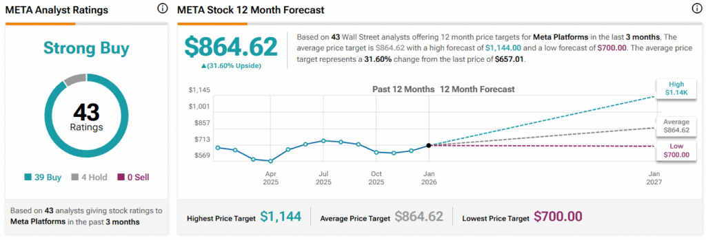 ウォール街では、META株は「強気買い」コンセンサス評価を受けており、39件の買い推奨、4件のホールド、ゼロの売り推奨があります。平均目標株価は$864.62で、31.60%の上昇余地を示しています。
