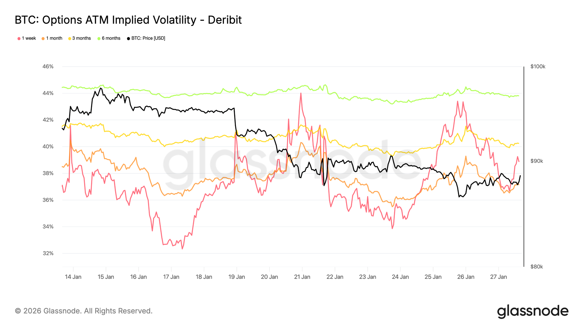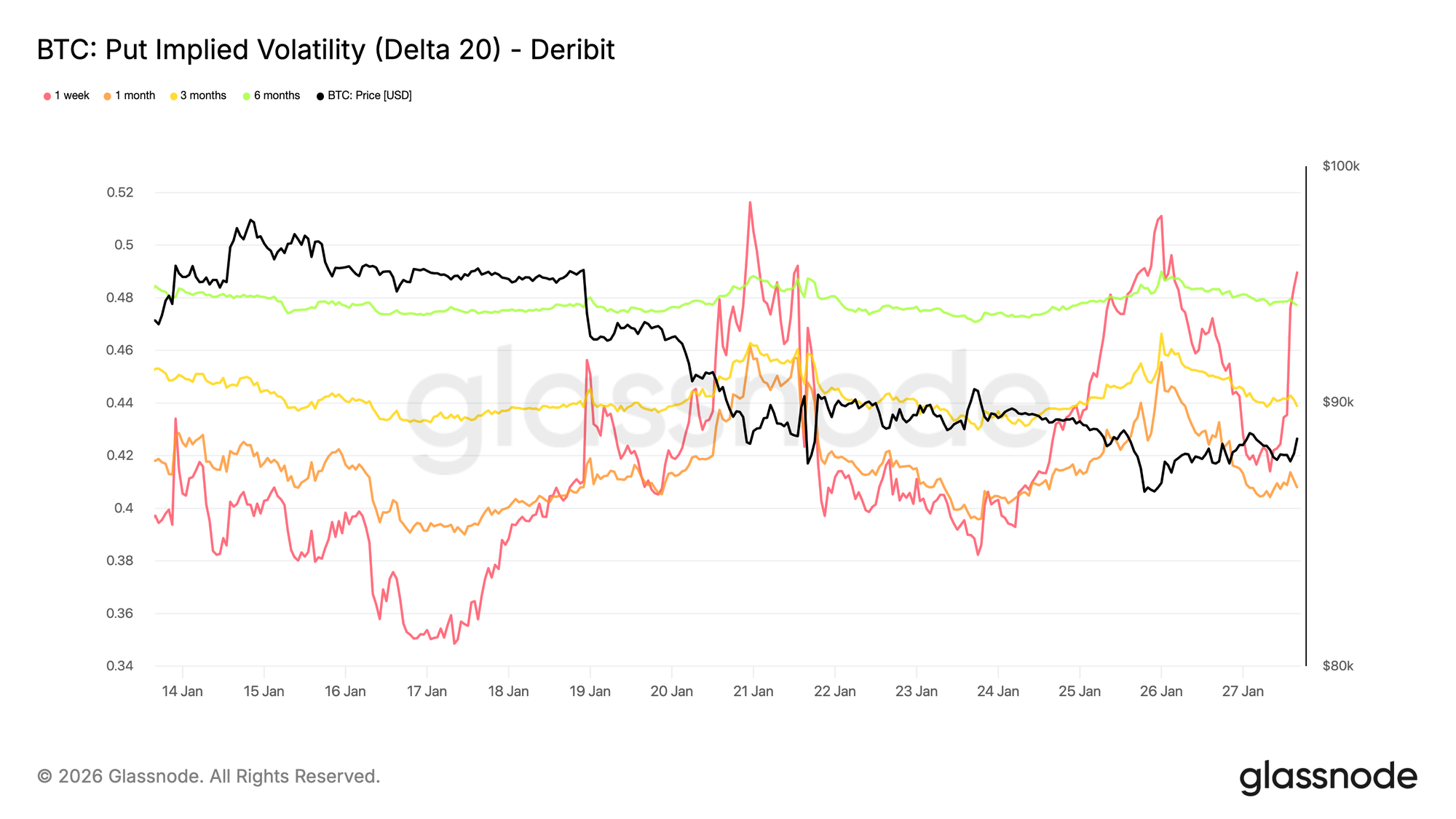 Esta volatilidade coincide com o aumento da incerteza geopolítica e riscos macroeconómicos mais amplos, que muitas vezes atingem primeiro o início da curva de volatilidade. A revalorização foca-se nas expirações de curto prazo, enquanto a volatilidade de longo prazo mantém-se relativamente estável.