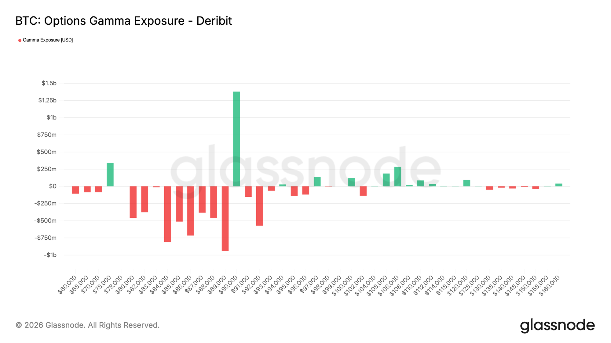 A exposição ao Market Maker Gamma revela uma característica estrutural significativa no layout atual. Os formadores de mercado encontram-se num estado de Gama baixista, num corredor amplo que se estende dos $90.000 até ao intervalo médio dos $75.000, coincidindo com uma zona de suporte a observar.