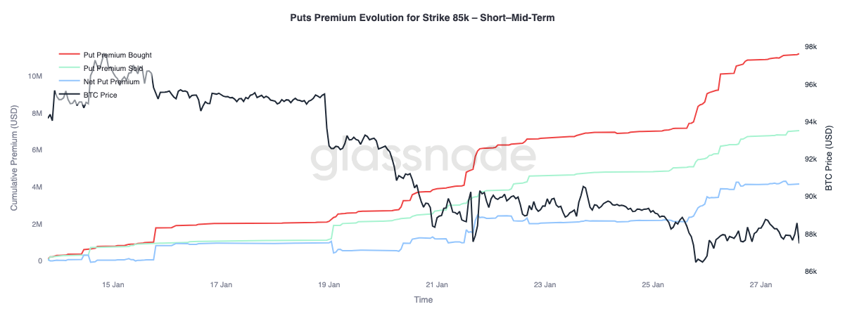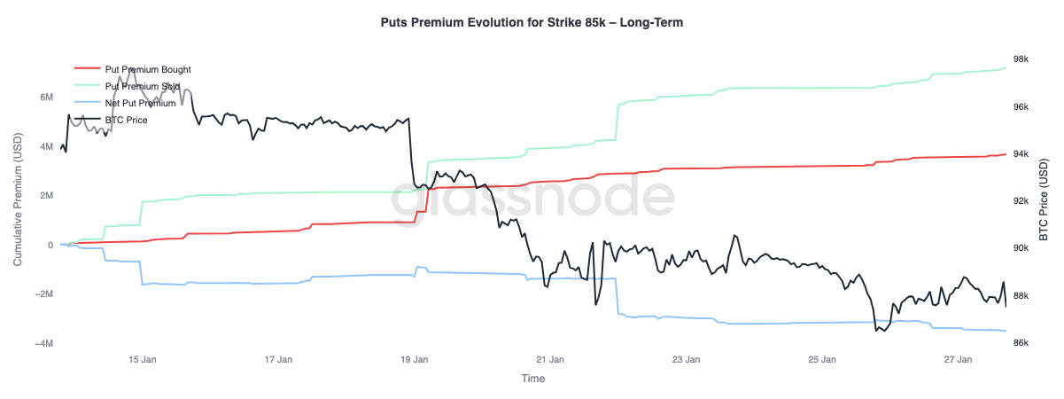 Focando-nos na alteração do prémio da put ao preço de exercício de 85.000 dólares, podemos observar dois padrões de comportamento distintos com datas de expiração diferentes. No curto e médio prazo (até três meses), o prémio de compra domina claramente o prémio de venda, impulsionando o prémio líquido da venda para cima.