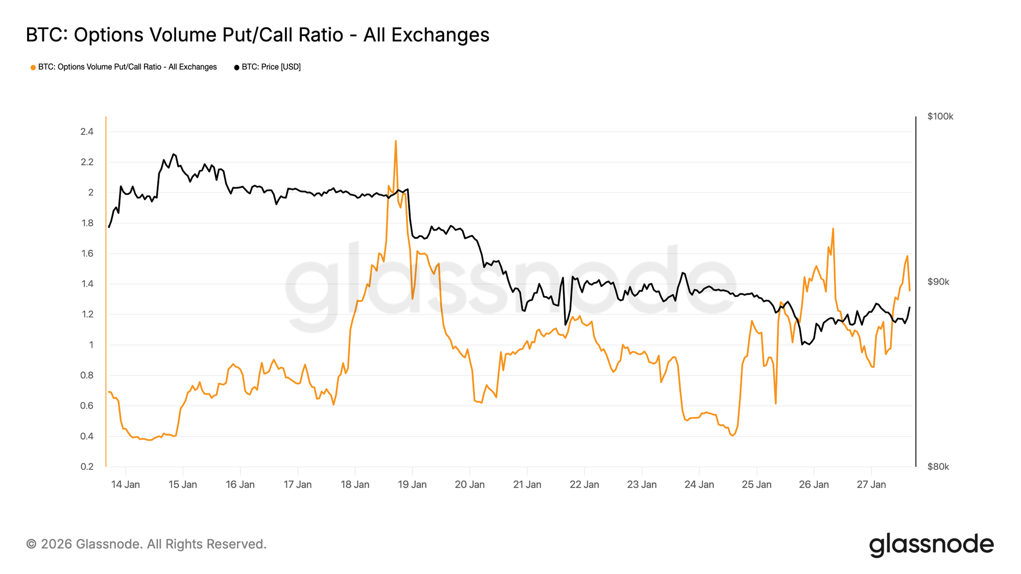 Isto revela uma nuance importante: os participantes estão dispostos a pagar um prémio relativamente elevado pela proteção contra a queda (em comparação com opções de compra) sem avaliar uma alta probabilidade de uma queda acentuada. Neste padrão, o sentimento é claramente defensivo, enquanto as expectativas de queda continuam ancoradas.