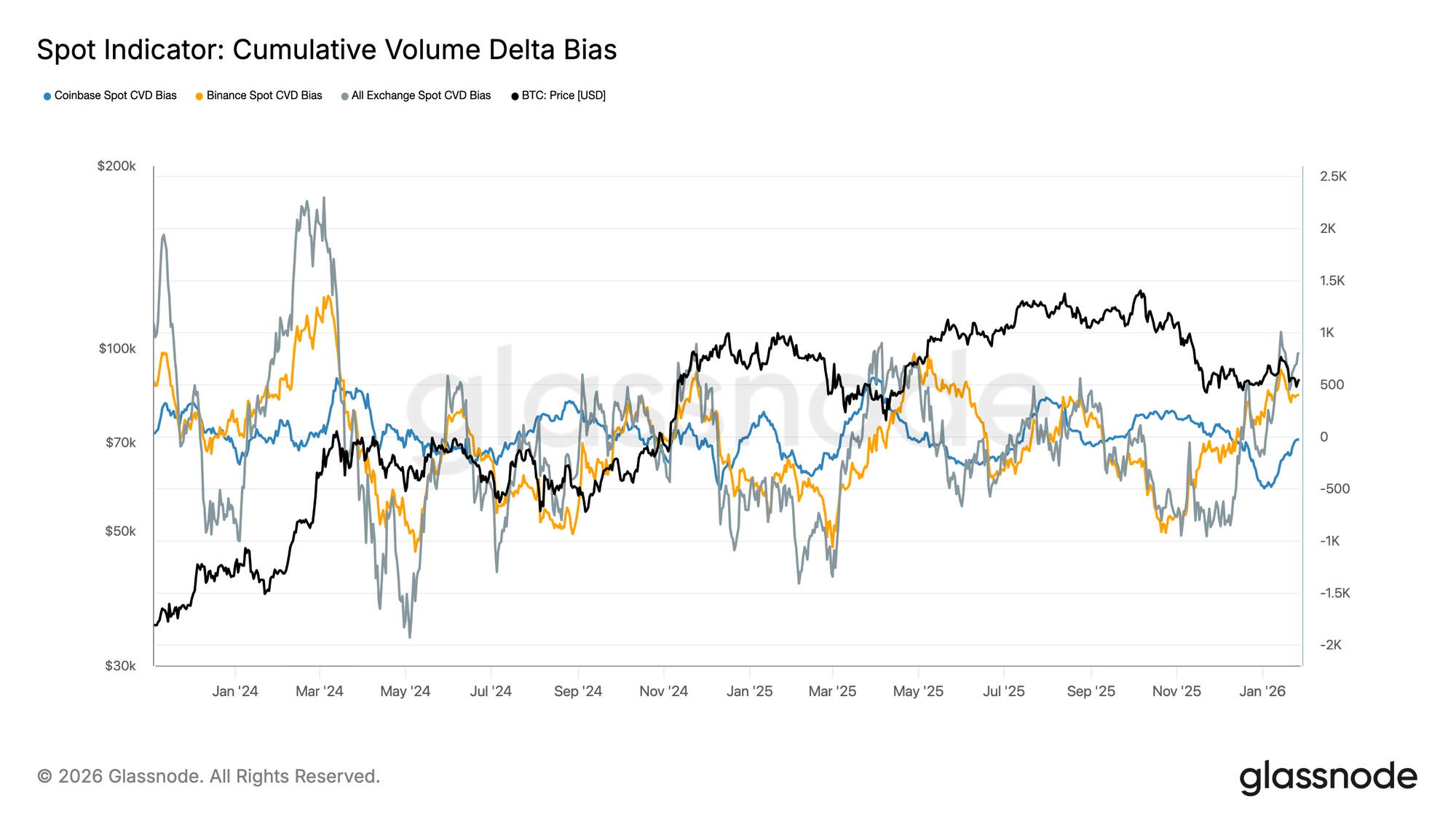 Os CVD à vista tendem a subir nas principais bolsas, sinalizando que a pressão de compra está a ressurgir após um período de baixa procura. A Binance liderou os ressaltos, recuperando fortemente de território negativo profundo, enquanto o viés da agregação em toda a bolsa também voltou para território positivo.
