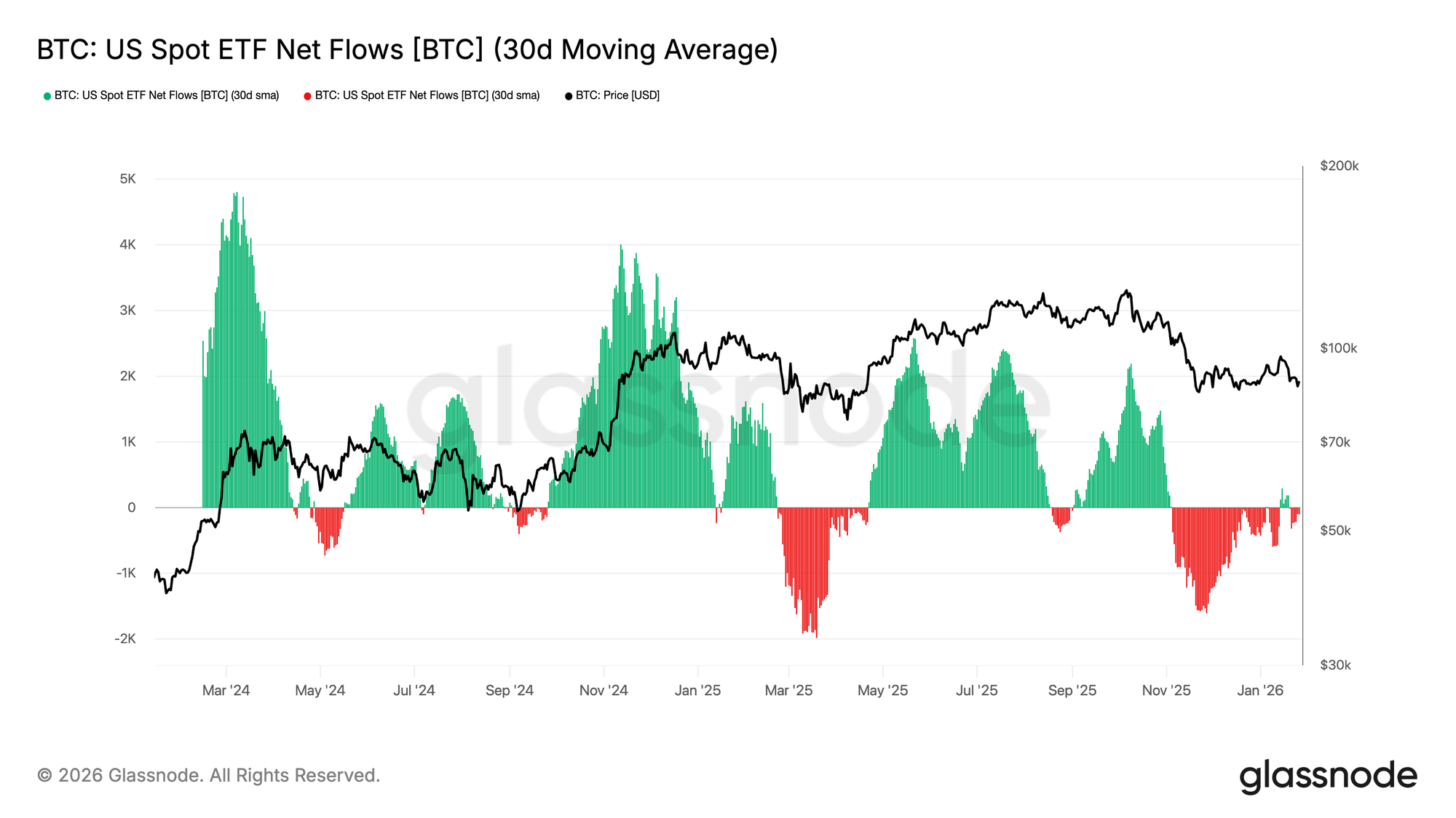 O fluxo líquido dos ETFs de Bitcoin à vista dos EUA voltou ao equilíbrio, e a média móvel de 30 dias está atualmente perto da linha do zero após um período de saídas líquidas sustentadas. Isto marca um arrefecimento significativo da pressão dos vendedores, com a compra estruturada a partir de ETFs a estabilizar-se gradualmente.