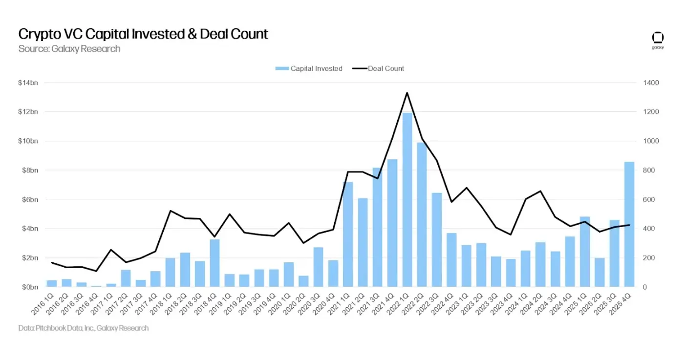 O investimento de capital de risco no setor de crypto e blockchain registou um forte aumento no quarto trimestre de 2025, principalmente devido a grandes operações em fases avançadas. Segundo o relatório da Galaxy Digital elaborado por Alex Thorn – Chefe do departamento de pesquisa de toda a empresa – os fundos de investimento investiram um total de 8,5 mil milhões de dólares em 425 operações neste trimestre, representando um aumento de 84% no valor do capital investido e um crescimento de 2,6% no número de operações em comparação com o terceiro trimestre de 2025.