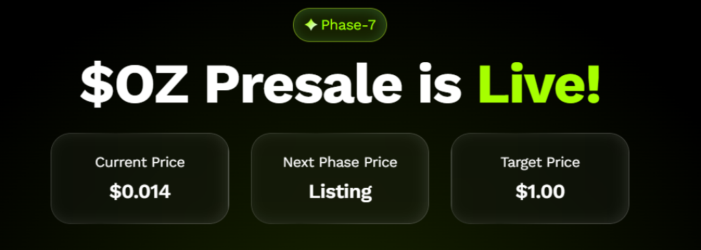 Ozak AI ($OZ) está próximo de $0,014 na fase de pré-venda. Com esse preço, uma entrada de $1.500 garante aproximadamente 107.142 tokens. Se ocorrer um movimento de 100×, o token chegaria a $1,40, colocando essa posição perto de $150 mil.