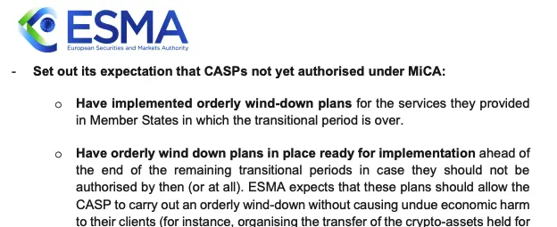A Autoridade Europeia de Valores Mobiliários e Mercados (ESMA), principal órgão de supervisão da Europa responsável por garantir a conformidade com o MiCA, afirmou em dezembro que espera que as empresas de criptomoedas sem autorização do MiCA tenham planos de “desligamento ordenado” assim que o período de transição terminar.