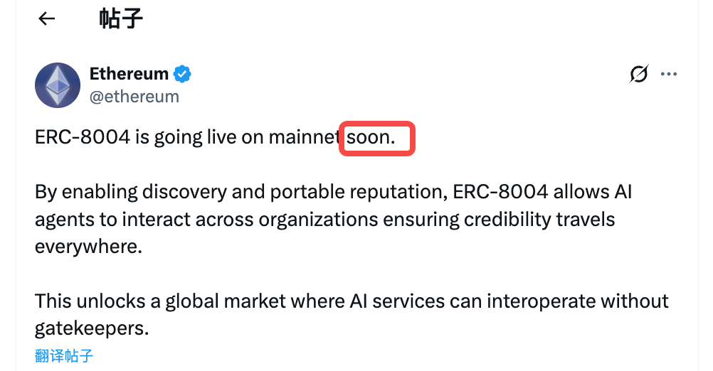 Em 28 de janeiro, a Ethereum Foundation anunciou oficialmente que o protocolo ERC-8004 está prestes a ser lançado na rede principal.