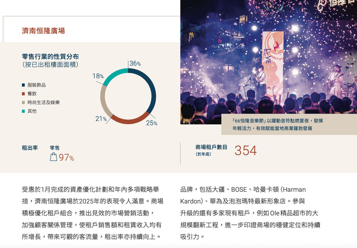 Entre uma série de ajustes, o Hang Lung Plaza de Jinan tornou-se um dos poucos projetos que conseguiram uma recuperação. Em 2025, as receitas deste projeto atingiram 323 milhões de RMB, um aumento de 2% em termos homólogos. As vendas dos inquilinos cresceram 6% e a taxa de ocupação recuperou de 93% para 97%.