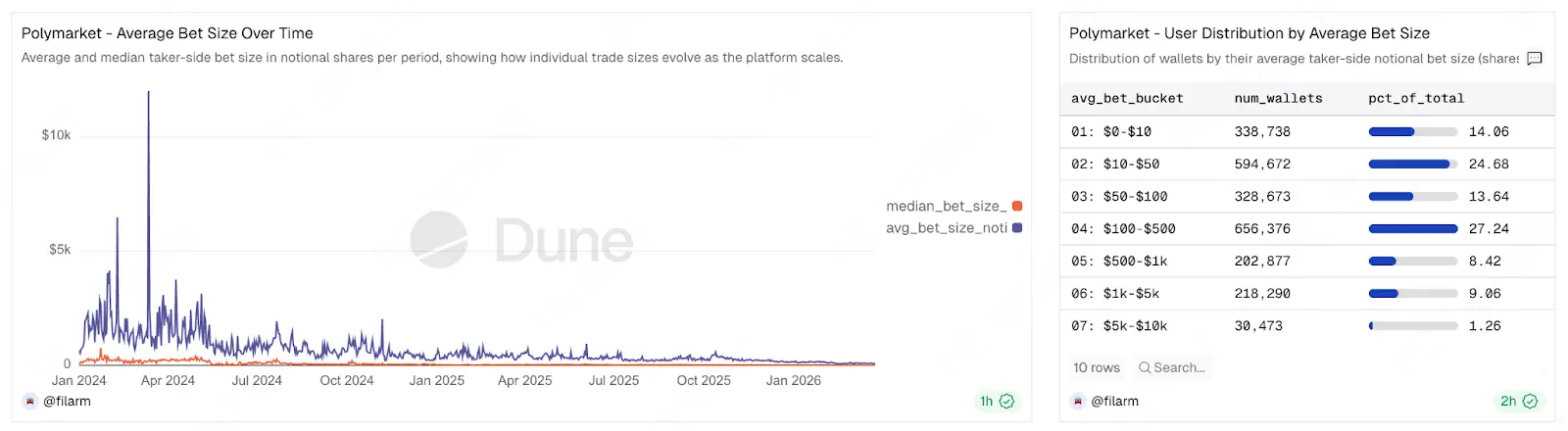 Кроме того, за этой волной регулирования стоит противоречие, от которого Polymarket не может уйти: ликвидность Polymarket не возникает естественным путем. Согласно данным on-chain, 80% пользователей платформы совершают разовые ставки на сумму менее 500 долларов. За последний месяц средняя ставка составляла около 100 долларов, поэтому реальную глубину рынка обеспечивают лишь очень немногие крупные трейдеры и провайдеры ликвидности.