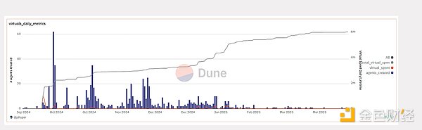 จำนวนการสร้างตัวแทนของ Virtuals จะสูงสุดในเดือนตุลาคม 2024 โดยมีการสร้างตัวแทนมากกว่า 60 ตัวในวันเดียว ก่อนที่จะมีการทดลองในเดือนพฤศจิกายนและธันวาคม ในต้นปี 2025 จำนวนการสร้างตัวแทนต่อวันลดลงเหลือเพียงหลักเดียว.