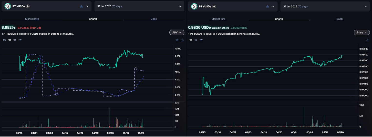 ดังนั้นตั้งแต่ AAVE สนับสนุนสินทรัพย์ PT เงินทุนที่ถูกวางเดิมพันจึงเพิ่มขึ้นอย่างรวดเร็ว ซึ่งก็แสดงให้เห็นว่ากลยุทธ์นี้ได้รับการยอมรับจากผู้ใช้ DeFi โดยเฉพาะอย่างยิ่งจากผู้ใช้งานขนาดใหญ่บางราย ขณะนี้ AAVE รองรับสินทรัพย์ PT สองประเภท ได้แก่ PT sUSDe กรกฎาคม และ PT eUSDe พฤษภาคม ขณะนี้ปริมาณรวมได้ถึงประมาณ $1B.