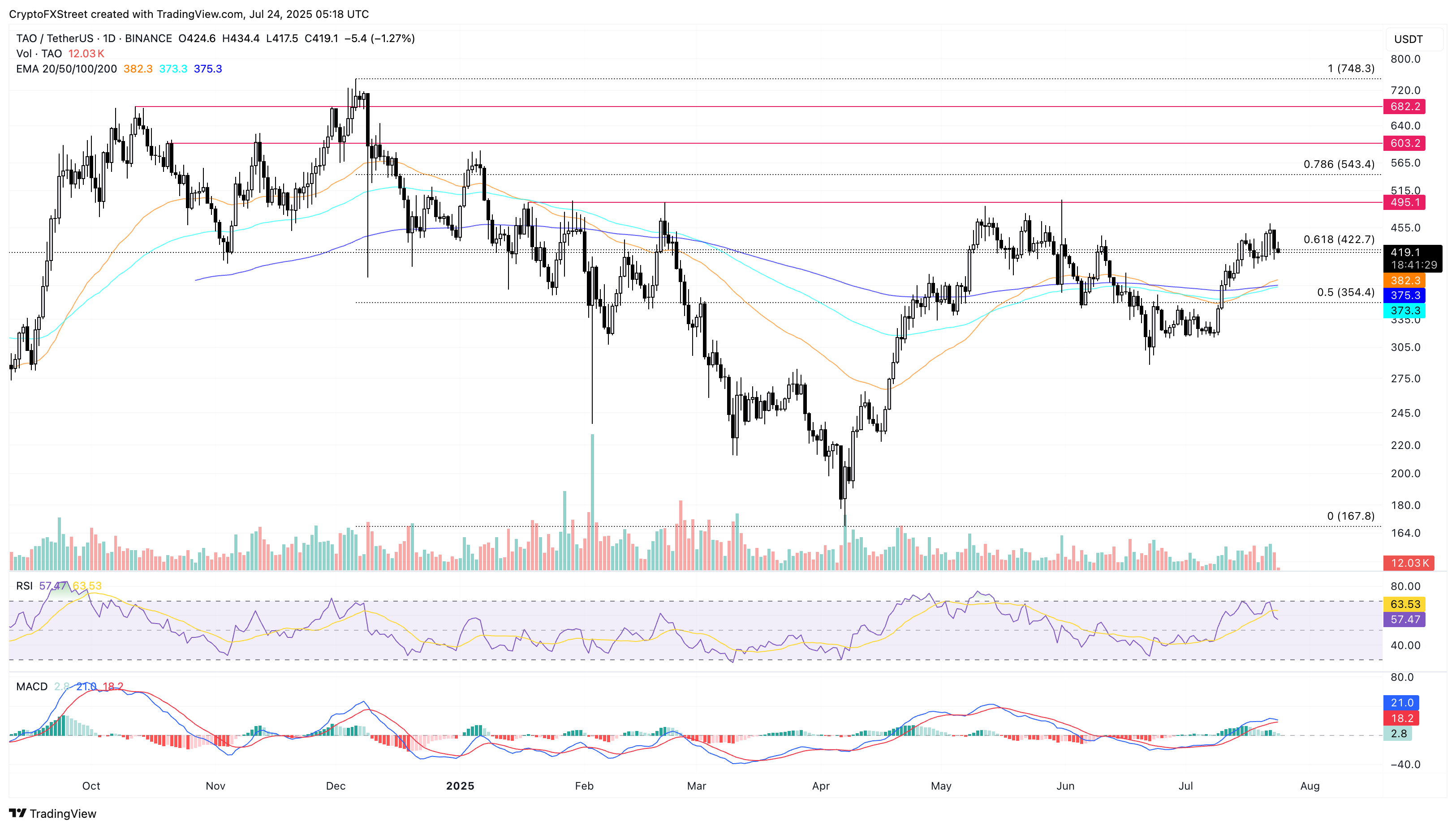 ณ วันพฤหัสบดี (24 กรกฎาคม) ขณะเขียน TAO ร่วงเกิน 1% ต่อเนื่องจากการร่วง 6% เมื่อวานนี้ อย่างไรก็ตาม สินทรัพย์คริปโต AI นี้ยังคงอยู่เหนือเส้นค่าเฉลี่ยเคลื่อนที่แบบเอ็กซ์โพเนนเชียล (EMA) 200 วัน และระดับจิตวิทยา 400 ดอลลาร์ในกราฟรายวัน.