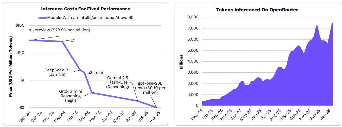 จากบางตัวชี้วัด ค่าใช้จ่ายในการคาดคะเนลดลงกว่า 99% ในปีที่ผ่านมา ด้วยการเพิ่มขึ้นของแอปพลิเคชันที่เป็น AI native ต้นทุนที่ลดลงนี้ผลักดันให้จำนวน token สำหรับการคาดคะเนของนักพัฒนา บริษัท และผู้บริโภคพุ่งพรวด ตั้งแต่ธันวาคม 2024 เป็นต้นมา ความต้องการการคำนวณของ OpenRouter (API สำหรับเข้าถึงโมเดลภาษาใหญ่) เติบโตขึ้น 25 เท่า