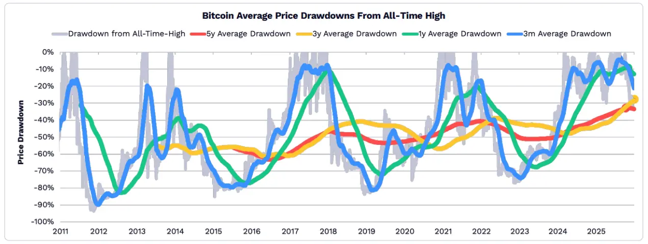 เนื่องจากบทบาทของ Bitcoin ในฐานะสินทรัพย์ป้องกันความเสี่ยงเพิ่มขึ้น ความผันผวนจึงลดลง จากมุมมองระยะ 5 ปี, 3 ปี, 1 ปี และ 3 เดือน การลดลงของ Bitcoin ในปี 2025 จึงอยู่ในระดับที่ค่อนข้างนุ่มนวลเมื่อเทียบกับประวัติศาสตร์