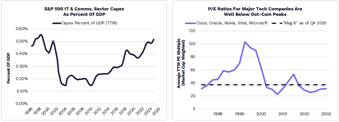 ตามการวิจัยของ ARK ผู้ดำเนินการศูนย์ข้อมูลขนาดใหญ่ในปี 2026 จะใช้จ่ายทุนเกิน 500 พันล้านดอลลาร์สหรัฐ ซึ่งเกือบสามเท่าของปี 2021 ที่มีมูลค่า 135 พันล้านดอลลาร์สหรัฐ (ก่อนกระแส ChatGPT ในปี 2022) แม้ว่าการใช้จ่ายทุนในภาคเทคโนโลยีและบริการสื่อสารจะสูงสุดในรอบตั้งแต่ปี 1998 แต่ P/E ของอุตสาหกรรมเทคโนโลยีอยู่ต่ำกว่าจุดสูงสุดในฟองสบู่เทคโนโลยีและโทรคมนาคมมาก