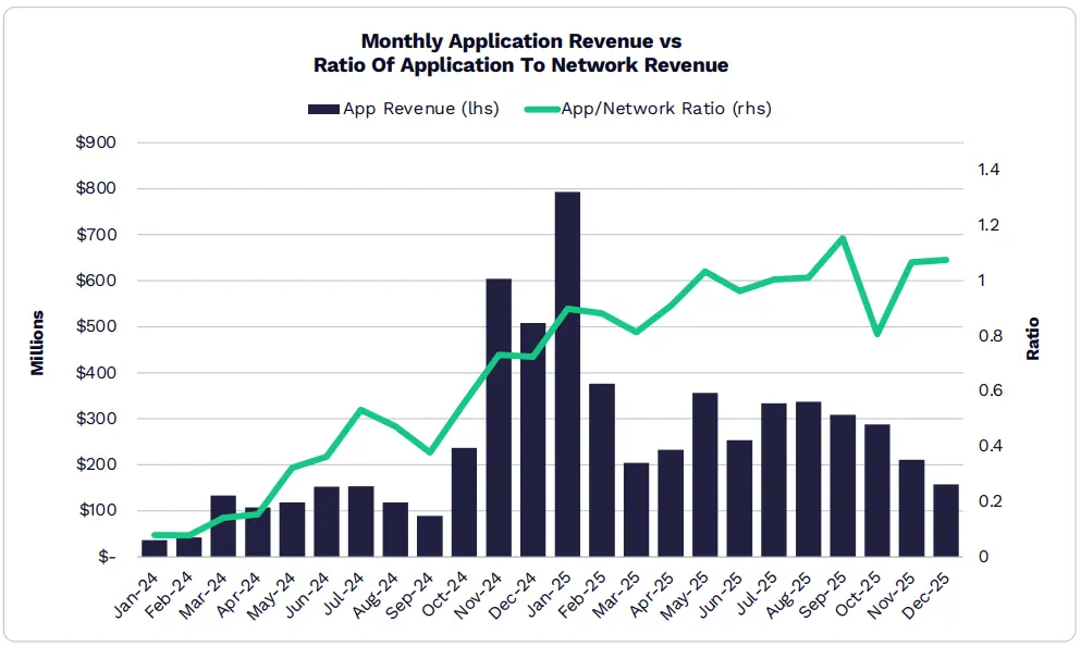 ภายใต้การนำของ Hyperliquid, Pump.fun และ Pancakeswap รายได้รวมของแอปในปี 2025 ทำสถิติสูงสุดประมาณ 3.8 พันล้านดอลลาร์สหรัฐ