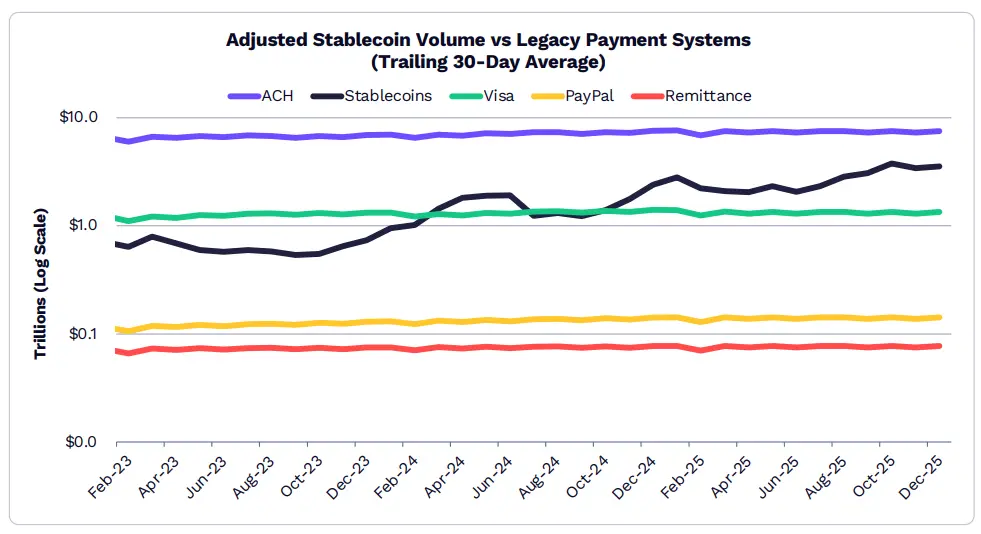 ในเดือนธันวาคม 2025 ปริมาณการซื้อขาย Stablecoin เฉลี่ย 30 วัน อยู่ที่ 3.5 ล้านล้านดอลลาร์ ซึ่งมากกว่ามูลค่ารวมของ Visa, PayPal และการโอนเงินระหว่างประเทศ (Remittances) ถึง 2.3 เท่า