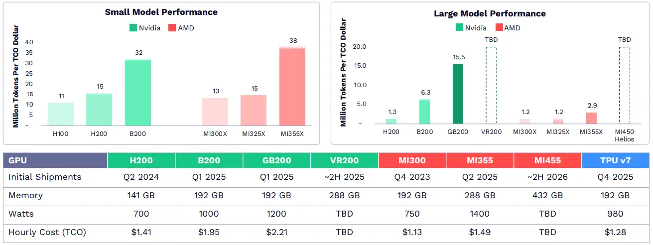 การลงทุนในด้านการออกแบบชิป AI, ซอฟต์แวร์ และเครือข่ายในช่วงต้น ทำให้ GPU ของ NVIDIA ครองส่วนแบ่งตลาดถึง 85% และมีกำไรขั้นต้น 75% ปัจจุบัน คู่แข่งอย่าง AMD และ Google ได้ตามทันในบางด้าน เช่น การคาดคะเนโมเดลภาษาเล็ก ๆ ระบบ Grace Blackwell ของ NVIDIA ยังคงเป็นผู้นำด้านการคาดคะเนโมเดลขนาดใหญ่ สนับสนุนโมเดลพื้นฐานที่ล้ำสมัยที่สุด