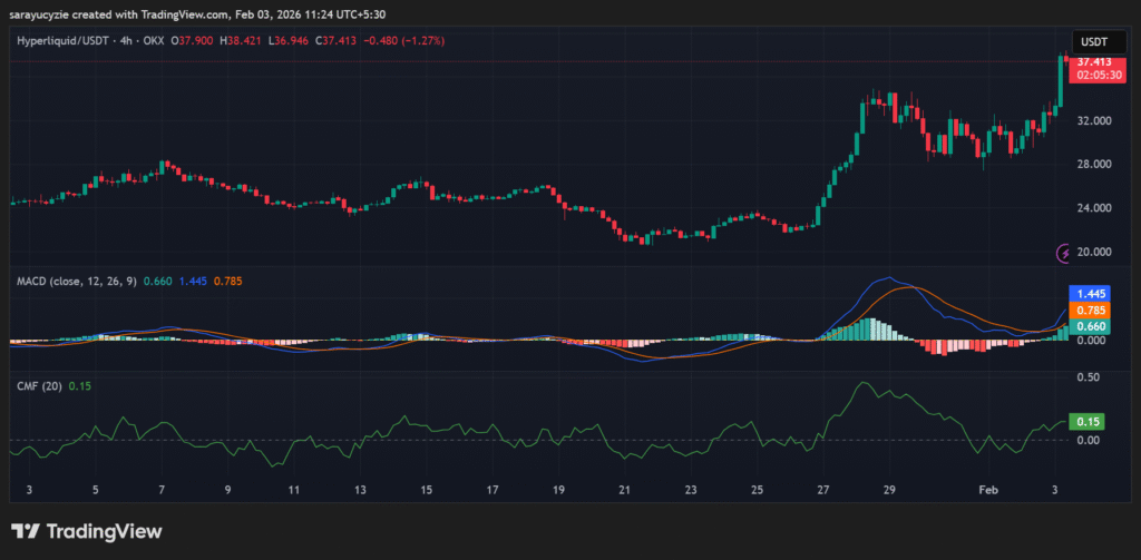 การวิเคราะห์ทางเทคนิคในช่วง 4 ชั่วโมงของ Hyperliquid แสดงให้เห็นว่าเส้น Moving Average Convergence Divergence อยู่เหนือเส้นสัญญาณ ซึ่งบ่งชี้ถึงโมเมนตัมขาขึ้น แนวโน้มระยะสั้นแข็งแกร่งกว่าระยะยาว และหาก MACD ยังคงเพิ่มขึ้น ก็อาจเห็นแนวโน้มขาขึ้นได้