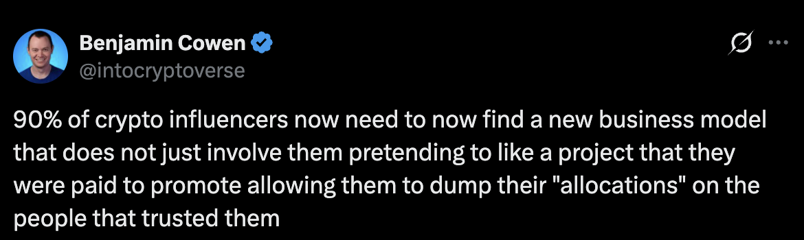 ภาพจาก: X/@intocryptoverse Benjamin Cowen กล่าวว่า นโยบายนี้จะบังคับให้ 90% ของ KOL คริปโตต้องหาโมเดลธุรกิจใหม่