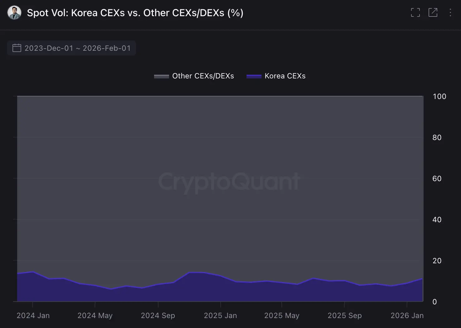 ข้อมูลจาก CryptoQuant ชี้ให้เห็นว่า หลังจากจุดสูงสุดในไตรมาสสี่ของปี 2024 ตลาดคริปโตเกาหลีมีส่วนแบ่งในตลาดโลกคงที่อยู่ในช่วง 8%–11% ตั้งแต่ปี 2025 เป็นต้นมา ในช่วงเดือนที่อารมณ์ตลาดเป็นลบและสภาพคล่องแห้งแล้ง ตลาดเกาหลี กลับมีส่วนแบ่งในตลาดโลกเพิ่มขึ้นเล็กน้อยอย่างน่าประหลาดใจ