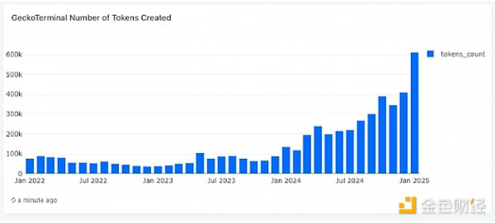ตามข้อมูลจาก GeckoTerminal ที่ถูกแชร์โดย Bobby Ong ผู้ร่วมก่อตั้งและประธานการดำเนินงานของ CoinGecko มีการเปิดตัวเหรียญดิจิทัลใหม่มากกว่า 600,000 สกุลในเดือน 1 ซึ่งเพิ่มขึ้น 12 เท่าเมื่อเทียบกับช่วงเดียวกันในปี 2024