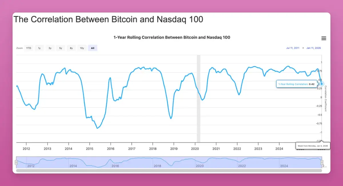 More importantly, Bitcoin’s correlation with traditional risk assets like Nasdaq has fallen to its lowest since 2022 (-0.42). While everyone hopes for correlation to rise, in the long run, as an uncorrelated asset sought by institutions, this is bullish.
