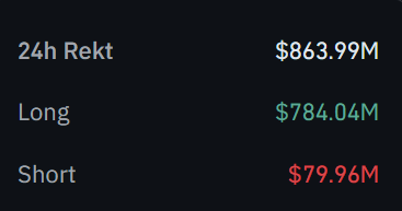 Around $864 million worth of crypto positions were liquidated in the last 24 hours, with over $784 million coming from long positions.