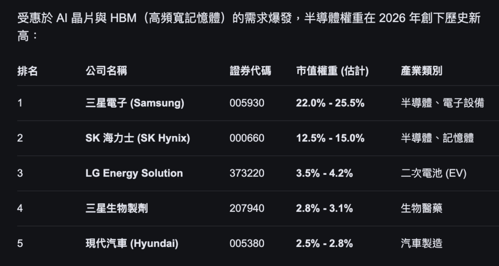 Furthermore, Samsung Electronics and SK Hynix’s core businesses are highly overlapping: both produce memory chips. DRAM and NAND Flash define almost the entire Korean semiconductor industry. When the global AI boom boosts demand for high-bandwidth memory (HBM), these two companies’ stock prices soar, pushing KOSPI from around 4,300 points at the start of the year to over 6,200 — nearly a 40% increase.