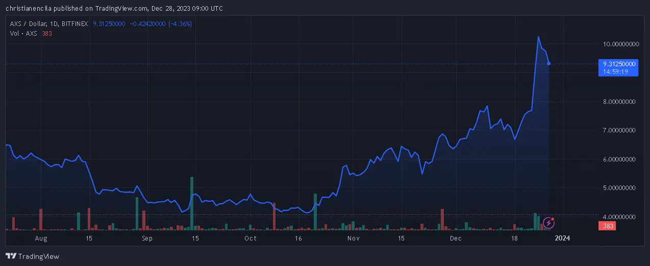 In the dynamic realm of cryptocurrencies, Axie Infinity’s AXS token has embarked on a remarkable ascent, witnessing an impressive surge of over 35% in the past 24 hours and currently trading at $9.26. This rally catapults AXS to the forefront of gaming cryptocurrencies, boasting a market capitalization of $1.4 billion and a circulating supply of 132 million coins.