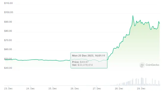 The Bitcoin Cash (BCH) blockchain’s hard fork, BSV, has been making record-breaking gains. With a price surge of more than 70% as of this writing, the cryptocurrency hit $84.8, a level not seen since April 2022.