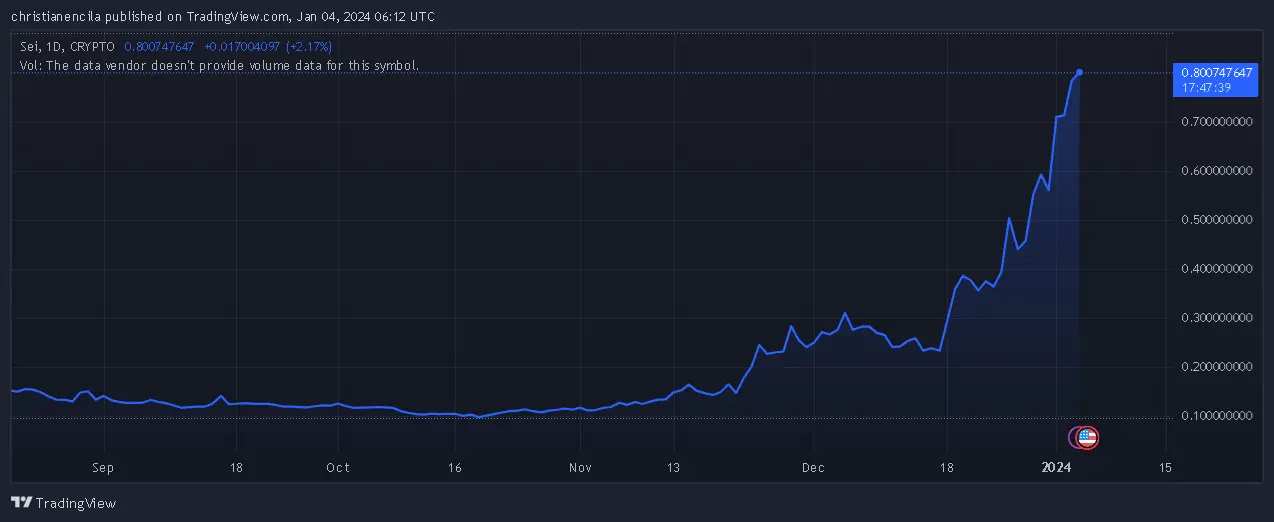 The Sei cryptocurrency has had significant purchasing demand in recent months, resulting in a price surge from $0.09 in October to $0.80 at present. This represents an astonishing increase in price of 665%, surpassing the majority of well-established cryptocurrencies on the market.