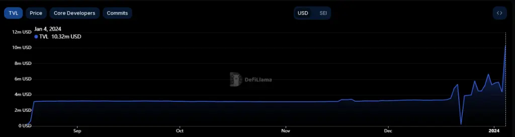 In addition to its price surge, the total value locked (TVL) on Sei has also increased. According to data from DefiLlama, the current value is $5.6 million, which represents a significant increase of 3,500% compared to the figures from August.