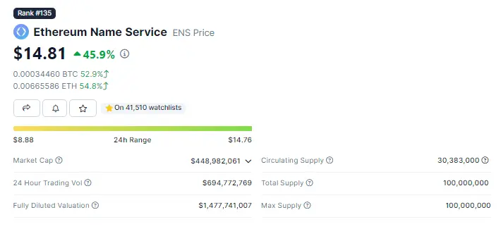 ENS presently has a circulating quantity of 30 million tokens, resulting in a market capitalization of over $404 million.