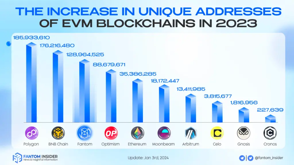 This disclosure positioned Fantom closely behind established entities like Polygon and Binance Chain, signaling a noteworthy achievement for the platform in expanding its user base and eco engagement throughout the course of 2023.
