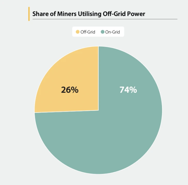 Одне важливе нове відкриття полягає в тому, що у світі 26% обчислювальної потужності біткойн-майнінгу походить з «офлайн» енергії (тобто енергії, яка не підключена до основної електромережі). Ці майнінгові ферми в основному розташовані в районах з нижчими витратами на електрику, близько до джерел чистої енергії, таких як райони з багатими водними ресурсами, високогірні території з потужним вітровим потенціалом, райони з багатими геотермальними ресурсами, а також є й такі, що використовують відпрацьований газ для генерації електроенергії.