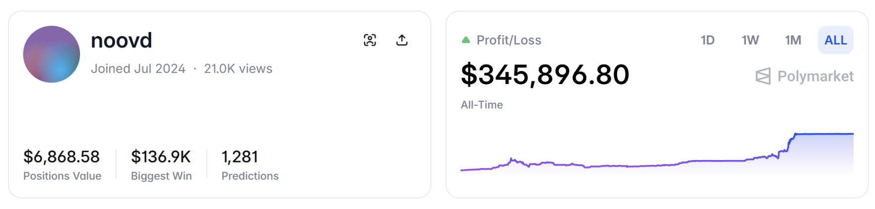 Офіційна сторінка показує, що він увійшов у ринок у липні 2024 року, і вже має чистий прибуток у 345 000 доларів. Цей гравець зробив усього 1281 прогноз, найбільший виграш склав понад 136 000 доларів, і зараз тримає позицію на 6877 доларів.