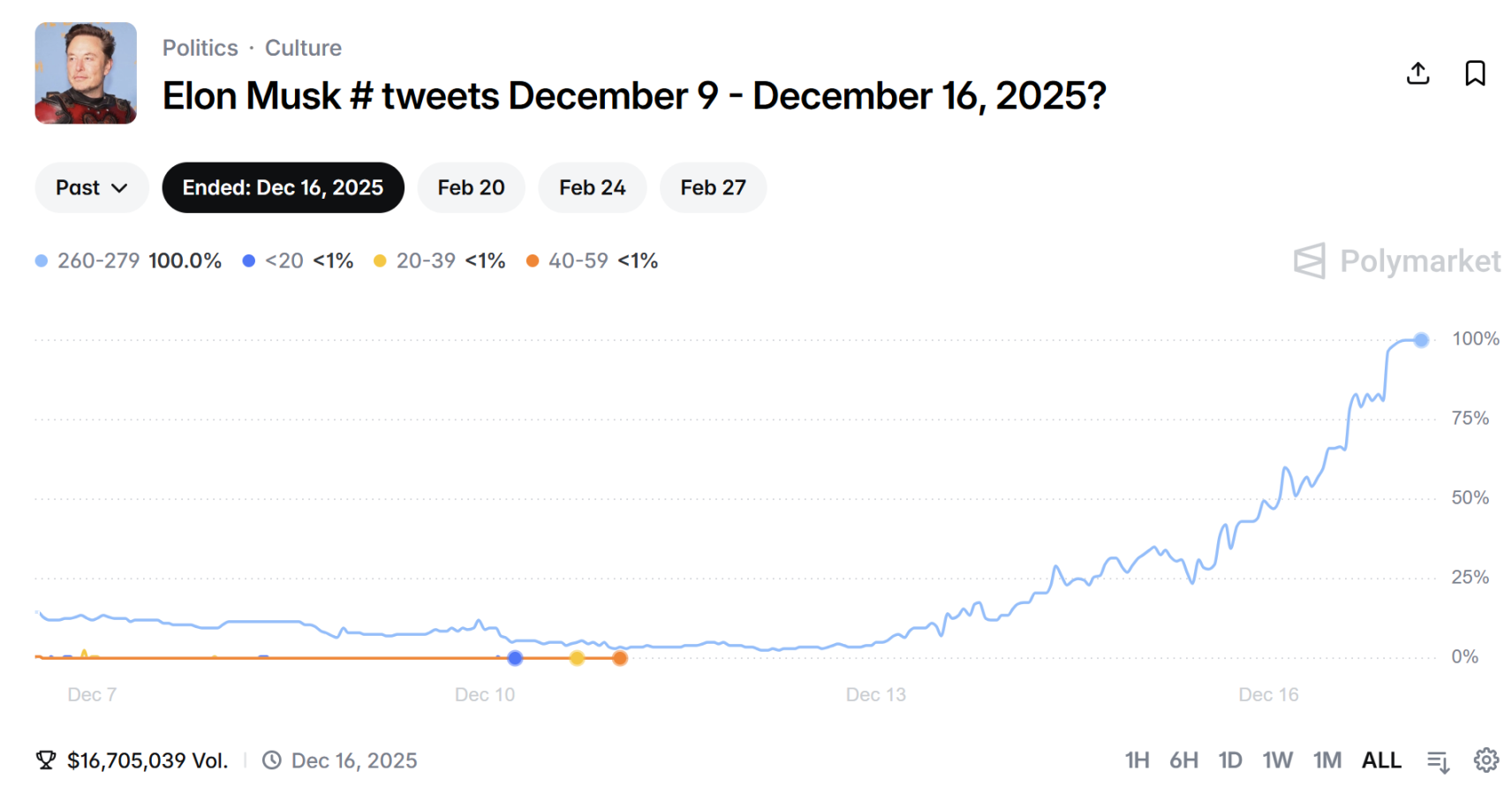 Polymarket щотижня розбиває кількість твітів Маска на кілька взаємовиключних діапазонів, кожен з яких охоплює близько 20 твітів — 200-219, 220-239… 420-439, навіть 850-874. Для роздрібних інвесторів, які бачать так багато варіантів, досить обрати щось середнє, купити за 35-50 центів — і отримати психологічне задоволення. А що з крайніми діапазонами? Їх ціна часто падає до 2-24 центів, хоча ймовірність у реальності становить 15-30%.