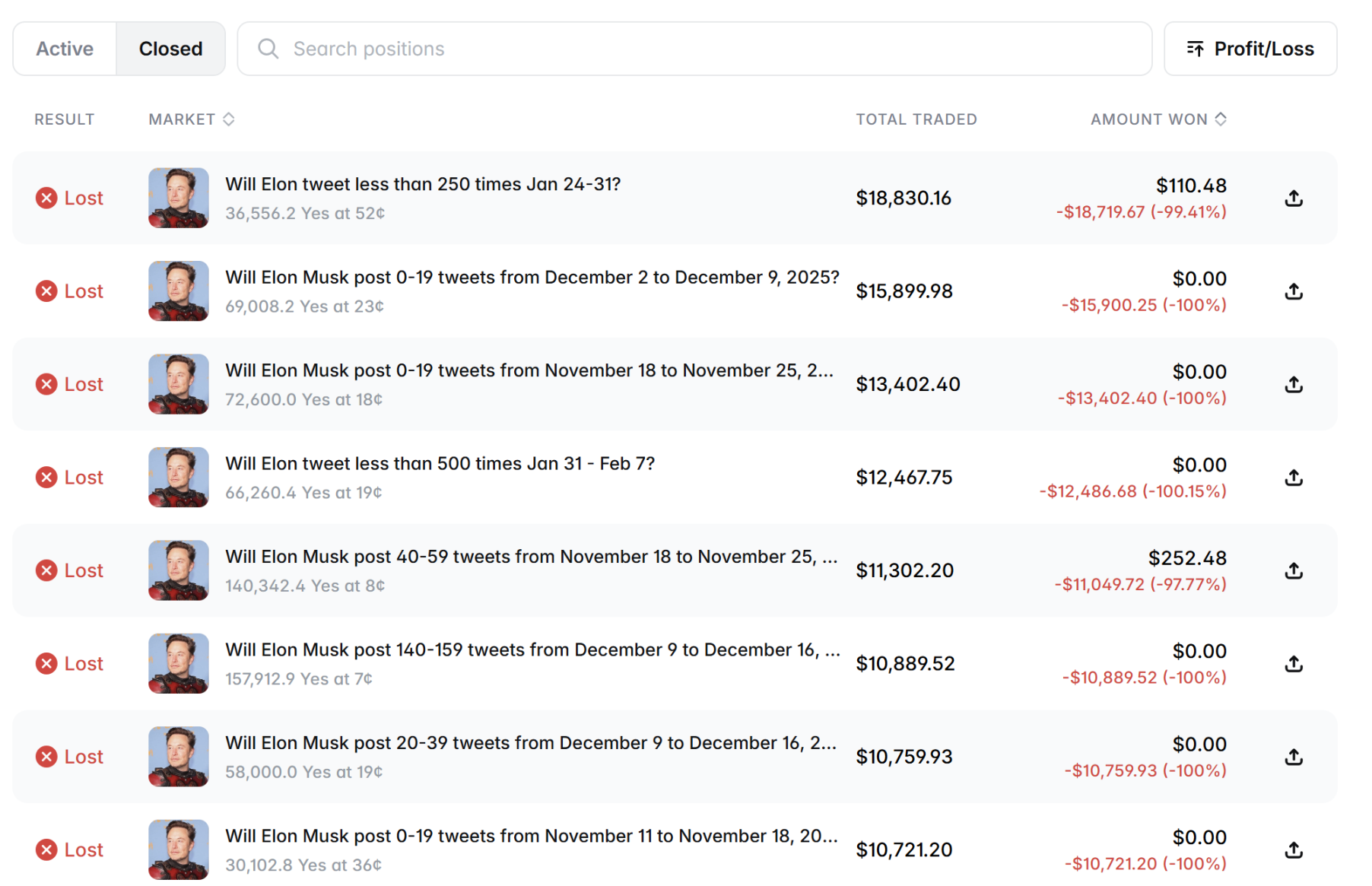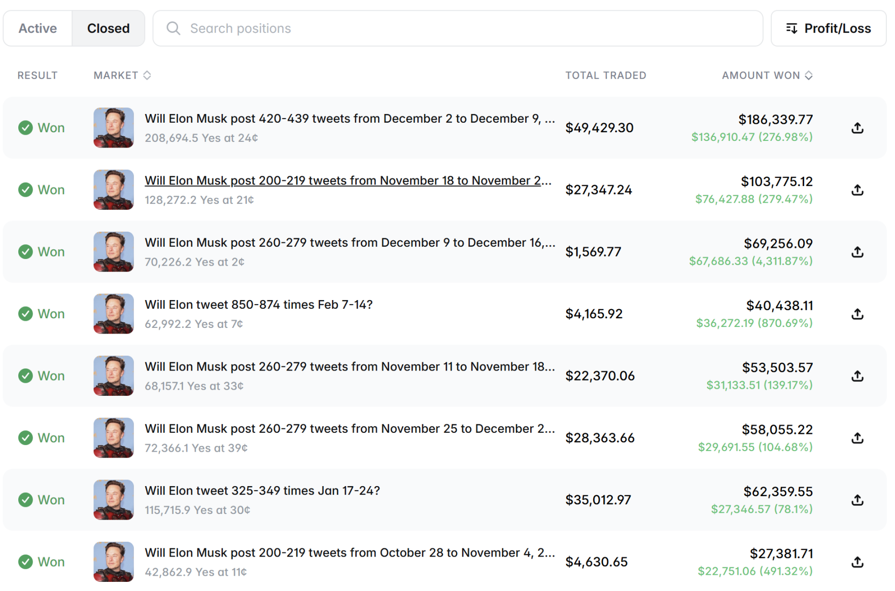 Він не вгадує рахунок у НБА, не ставить на політичні події — він зосереджений лише на цій галузі. Перевіривши його історію закритих угод, видно, що перші вісім прибутків — це «Цього тижня Маск напише X до Y твітів?», тобто «так».
