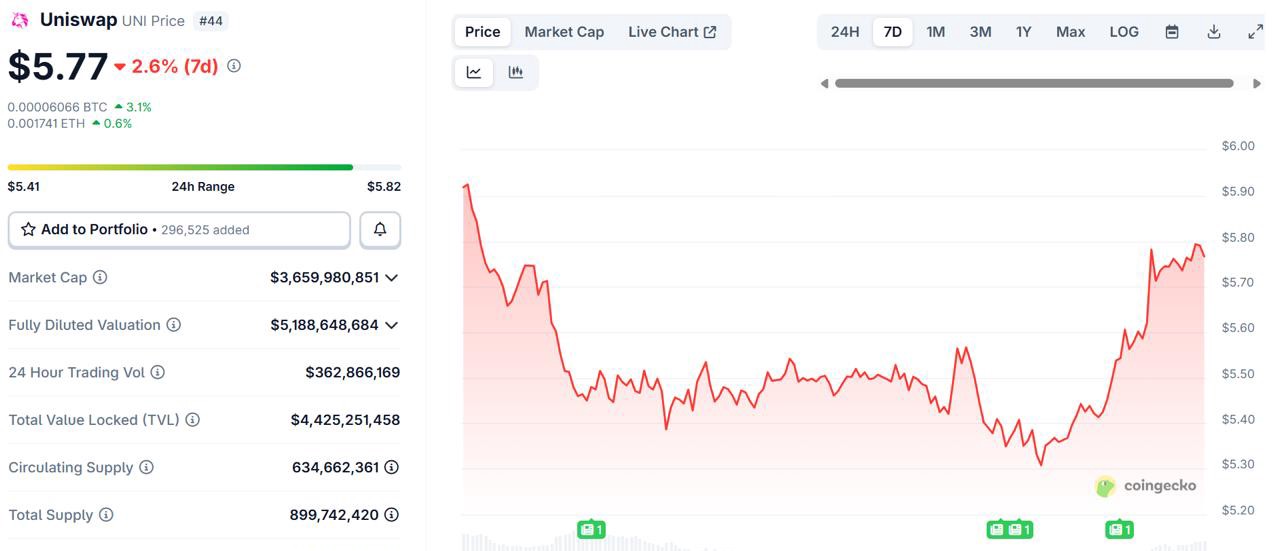На момент написання ціна Uniswap коливається між $5.76 і $5.79, що свідчить про зростання на 6% до 6.75% за останні 24 години. Обсяг торгів становить близько $274 мільйонів до $276 мільйонів, що свідчить про підтримку від стабільної участі. Ринкова капіталізація залишається близько $3.65 мільярдів до $3.68 мільярдів, що розміщує UNI у топ-30 за розміром.
