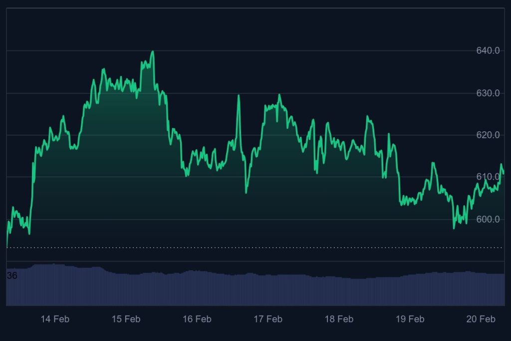 BNB chỉ tăng nhẹ trong tuần qua khi thị trường altcoin rộng lớn vẫn chịu áp lực. Token giao dịch ở mức 593 đô la ngày 14 tháng 2, trước khi tăng lên 613 đô la ngày 20 tháng 2, đánh dấu mức tăng nhẹ 2% trong tuần.