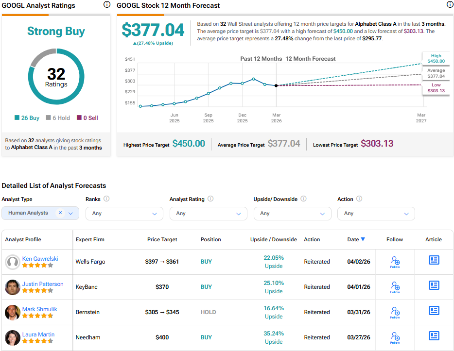Chuyển sang Phố Wall, các nhà phân tích có đánh giá đồng thuận Strong Buy đối với cổ phiếu GOOGL dựa trên 26 lượt Mua và sáu lượt Giữ (Hold) được gán trong ba tháng qua. Ngoài ra, mục tiêu giá trung bình của GOOGL là 377.04 USD mỗi cổ phiếu cho thấy tiềm năng tăng giá 27,5%.