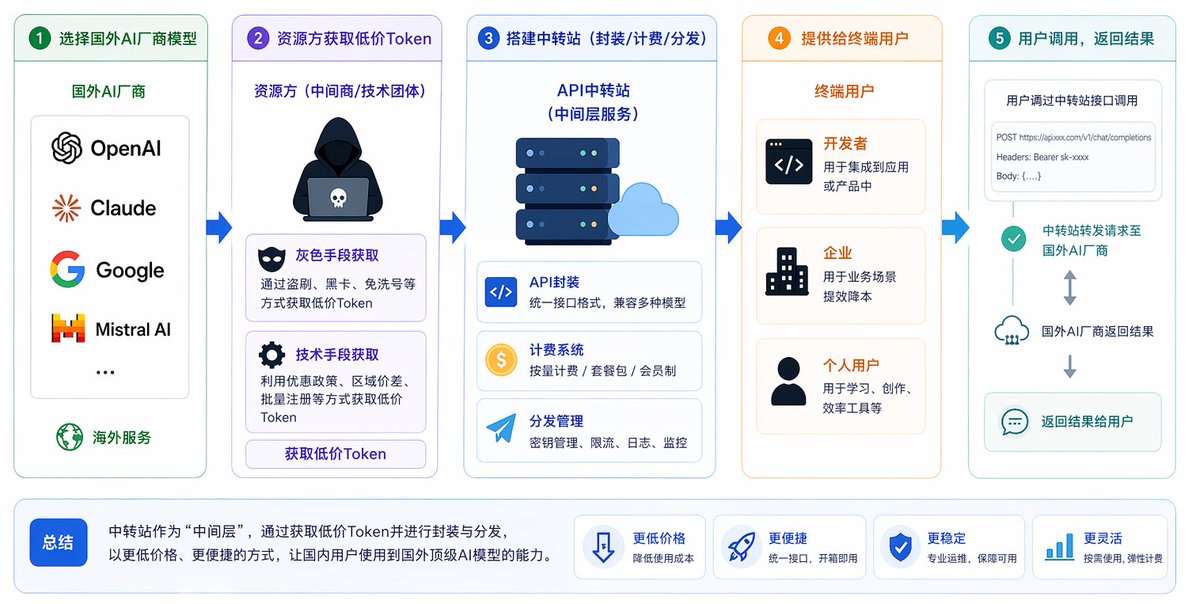 Bản chất của API Trung chuyển là xây dựng một lớp dịch vụ trung gian, cung cấp Token API của các nhà cung cấp AI nước ngoài với giá thấp hơn, tiện lợi hơn cho người dùng trong nước, được gọi là 「Nhà vận chuyển Token toàn cầu」.