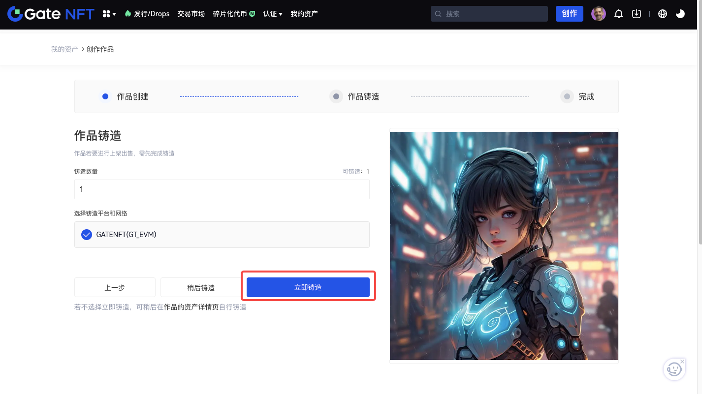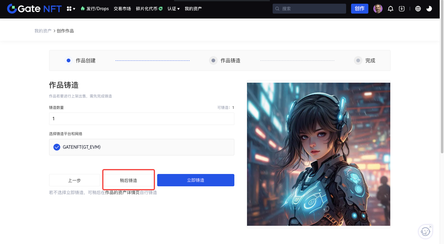 您也可以點擊「稍後鑄造」按鈕,稍後可在作品的創作詳情頁自行鑄造;