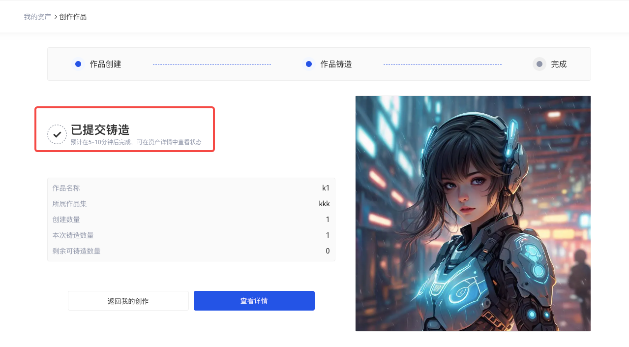 提交鑄造後,一般作品會在5-10 分鍾後完成,您可點擊「查看詳情」,在創作詳情頁面查看作品鑄造狀態;