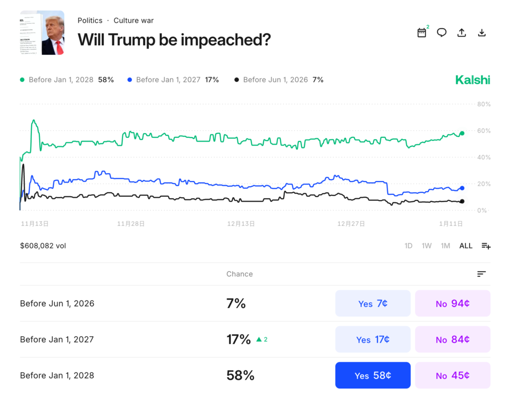 預測市場 Kalshi 合約顯示川普在 2028 年前遭彈劾機率升至 58%,民主黨若奪回眾議院,川普恐面臨第三度彈劾。