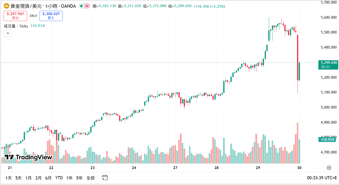 貴金屬市場的波動尤為劇烈。現貨黃金在短短 30 分鐘內連破三道整百關口,從日內高點暴跌超過 400 美元,抹去約 2.5 兆美元市值,相當於整個加密貨幣市場的總值。現貨白銀亦重挫 8%,從高點 121 美元/盎司回落至 108 美元/盎司附近。